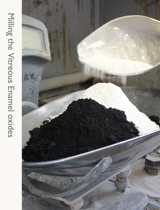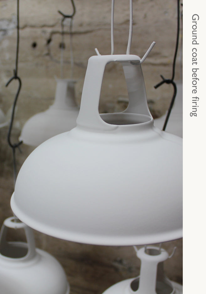 Notre procédé d'émaillage vitrifié permet de créer des produits uniques et magnifiques. Il arrive que l'émail apparaisse de manière différente selon la teinte, ce qui confère à votre abat-jour sa propre identité. Pendant la cuisson, les minéraux et les oxydes peuvent s'accumuler et former de petites bosses ou même changer de couleur sous l'effet de la chaleur du four. En réagissant avec le verre, ils peuvent former de petites taches sombres ou claires. Nous appelons affectueusement ces marques de caractère des taches de rousseur, aussi spécifiques à chaque teinte qu'à chaque personne.