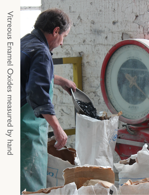 Notre procédé d'émail vitrifié permet de créer des produits uniques et magnifiques. Au fur et à mesure que l'émail fond et coule sur la surface des abat-jours sous la chaleur du four, des variations d'épaisseur peuvent se produire. Ces variations se trouvent le plus souvent sur les contours de l'abat-jour et là où l'émail s'amincit sur le bord très incurvé. Notre émail vitrifié Sky Blue bleu ciel contient certains des oxydes les plus réactifs avec lesquels nous travaillons. Parfois, lorsqu'ils sont exposés aux températures extrêmement élevées du four, les oxydes peuvent subir un jaunissement subtil, créant une illusion de sable sous les vagues. Cela se voit surtout dans les zones d'émail plus fin, comme sur les contours et le bord de l'abat-jour.