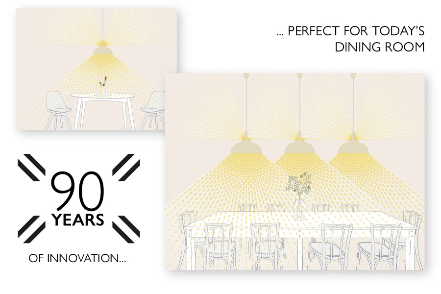 Hanging a single shade above a square or round table provides the dining room with a warm ambient light whilst the downlight provides a gentle cone of task light to illuminate your table.