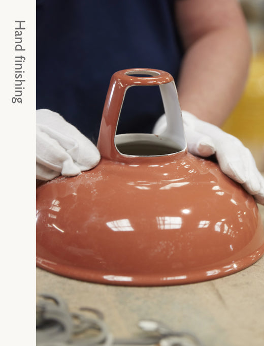 Coolicon lampshades are handmade, and hand finished. There are touch points all over our lampshades giving them their character and quirks. From the weld smoothing at the very beginning of their journey, to the hand enamelling, to the gold Coolicon badge application at the end of their journey – our lampshades are shaped by human influence.