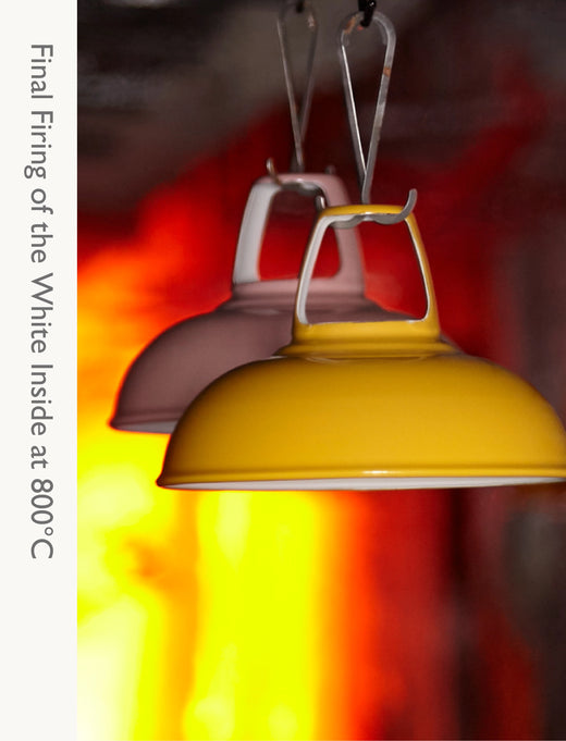 Made in Britain, Coolicon’s Vitreous Enamel finish is hand applied by generations of skilfully trained craftspeople. As the finish is built layer by layer, the lampshade must be fired after every layer application to solidify the durable finish. At the fiery temperatures of 800°C, the final characteristics of your lampshade come to light. Exiting the furnace red hot, the lampshades are then left to cool, over time revealing their rich colours ready to carry on the Coolicon journey.