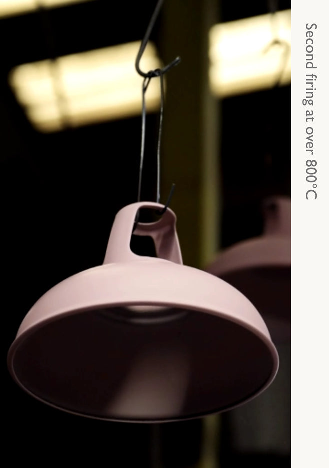 To ensure the strong durability and longevity of a Coolicon lampshade we thoroughly prepare the shade prior to enamelling. We begin by de-greasing and etching the steel body of the lampshade, this allows a strong foundation for the enamel to grip and adhere to the steel shade.