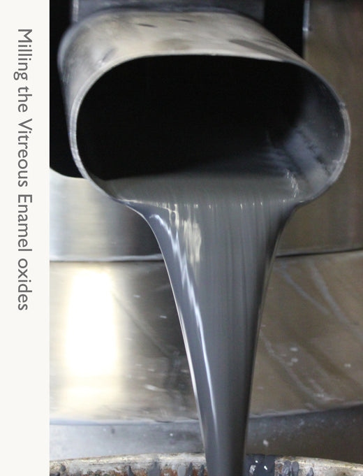 To create the rich colours of our Vitreous Enamel finishes, glass chips, minerals and oxides must be milled and mixed. These materials are naturally occurring and completely safe - the viscosity of the enamel can be gauged by hand.